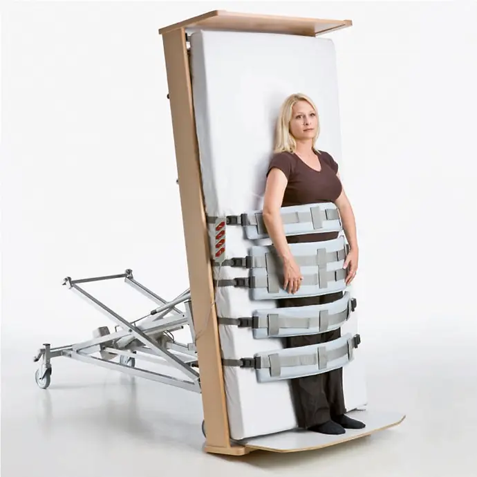 Ein Stehbett kombiniert die normalen Funktionen eines Pflegebetts mit der Aufricht-Funktion bis zur fast senkrechten Position von ca. 85°.