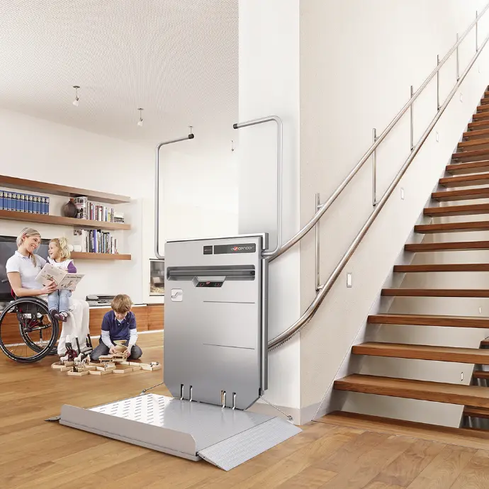 Muss eine Höhe bis 3m (im privat Bereich bis 4m) überwunden werden, kommt ein Plattformvertikallift zum Einsatz.
