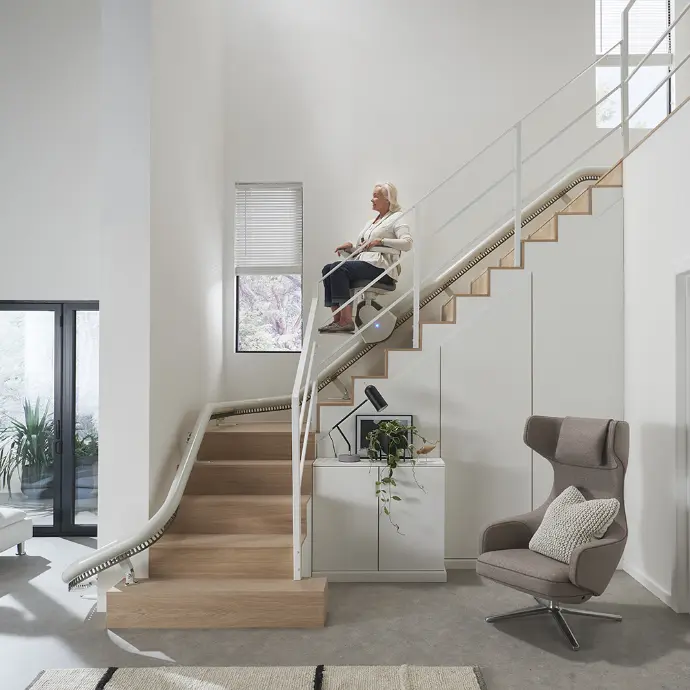 Für Personen, die selbst gehen können, aber Treppensteigen beschwerlich ist, erleichtert ein Treppenlift mit einem Sitz den Alltag, das ist ein sogenannter Sitz-Treppenlift.